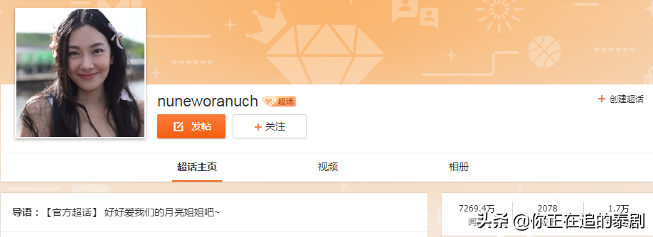 陈星宇简评:noon月亮姐姐今年在微博上的发布非常频繁,她也非常热衷与中粉互动。2019年泰剧《爱就要报复回来(美丽的谎言)》让她登上热门话题,noon与joss war 的新鲜cp组合,改变了月亮姐既定形象,成功吸引了更多年轻观众的喜爱。noon的最新作品是泰国change2561 泰剧《刹中得爱 / ?????*?????》。