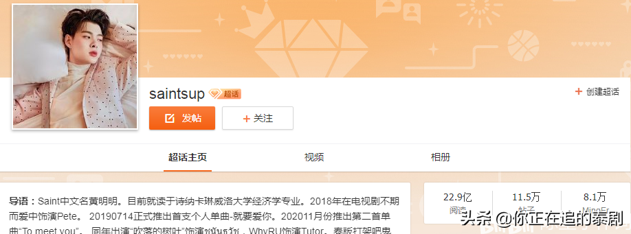 陈星宇简评:泰国当红偶像黄明明saint 上月刚刚给粉丝们带来了一场精彩大秀《solosaint 2020 race to bangkok( saint曼谷竞速个人见面会)》,现场非常火爆。saint绝对算是泰国新生代偶像中使用微博互动频率非常高的艺人之一,无论是日常分享,还是作品分享,又或是商业品牌互动,saint的微博曝光量很猛。另外saint的粉丝们互动量也是非常高,超话阅读量达到二十多亿的阅读,十一万的互动贴。今年,他从诗纳卡琳威洛大学经济学院毕业,明年他将全身心投入到工作中。最新作品是电影《?????? 祈求你 begging u》。