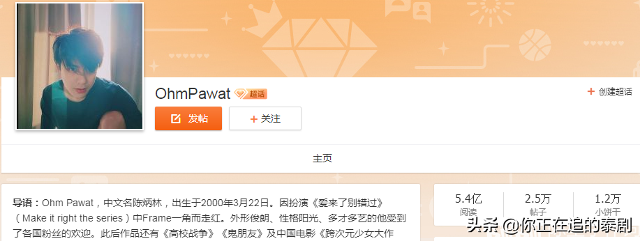 陈星宇简评:ohm pawat凭借2016泰剧《爱来了别错过》走红,签约gmm后,出演了一系列话题剧《黑名单》《军营密恋》《燃烧的腐魂》等,去年的人气泰剧《清明时节爱上我》让他获得不少口碑。明年最新泰剧作品是《是朋友还是男友(两小无拆 / bad buddy series)》,ohm pawat将与nanon korapat组成新晋cp档了。