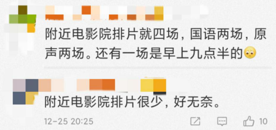 网友纷纷在社交平台留言表示很无奈,想看这部电影但是附近的影院都没有排片。有人提及自己附近的影院一天只有四场,甚至还有早上9:30分的场次。