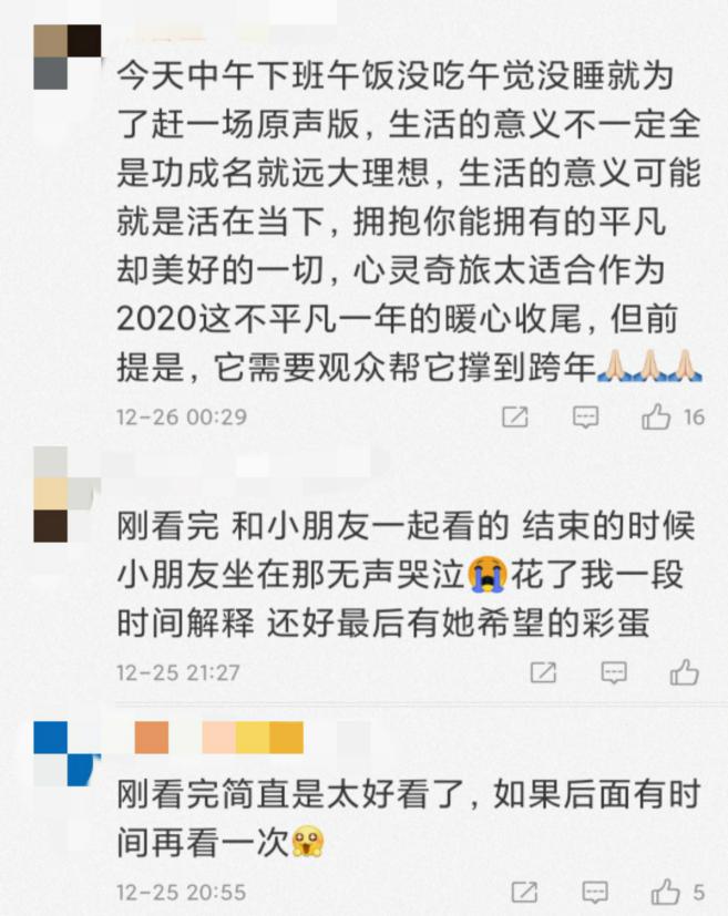 在意外频发的2020年年末,这样一部积极乐观的电影如同一针强心剂,让许多疲惫沮丧的人群得到了抚慰。许多观众看完影片后,表示还想再看一场,也有人觉得这部电影给不平凡的一年带来了暖心收尾。