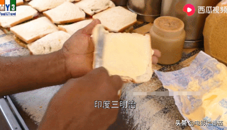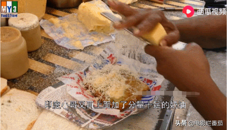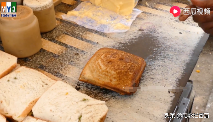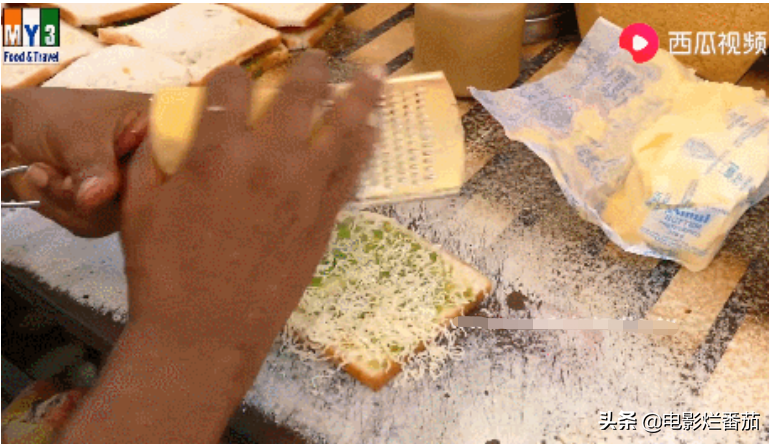 只见摊主拿出两片吐司分开后,快速拿沾了黄油的小刀在吐司上来回剐蹭,不一会儿就把片面包抹得满满当当,看了就让人胃口大开。