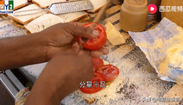 在压完土豆泥后,老板又拿出了番茄和青椒,手法娴熟地迅速将其切成片铺在土豆泥之上,而后又再次加上秘制调味粉和芝士碎,最后用另一片面包压在所有的食材上。