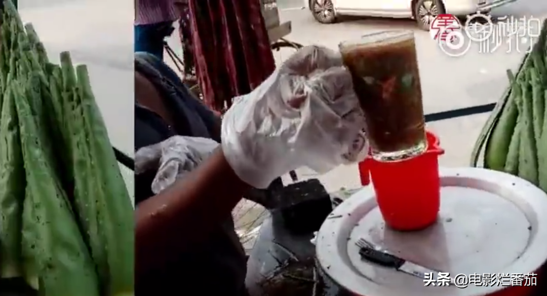 当有顾客购买时,老板就会从桶里捞出黏糊糊的芦荟汁,然后加入砂糖、香料不停搅拌以保证整杯芦荟汁的味道是均匀的。