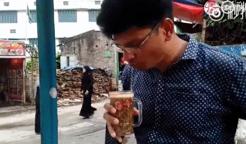 在搅拌充分后,老板才会将芦荟汁倒入杯中,而此时杯中的液体呈现出的是棕色,上面还漂浮着搅拌引起的细沫。