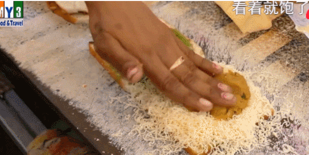 这还不算完,摊主还要在拿出来的烤三明治上,淋上大量的奶油和奶酪碎才算大功告成。