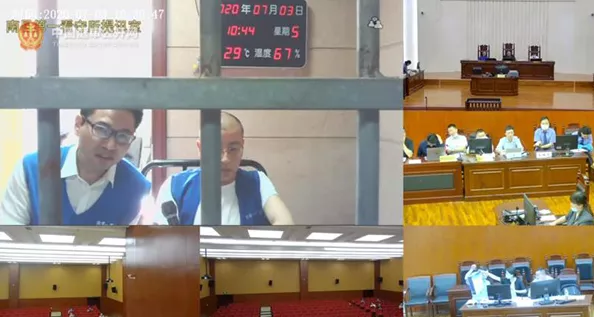 画面中,吴军豹带着眼镜,穿着看守所的马甲,跟老搭档坐一起,全程神情泰然,发言积极。