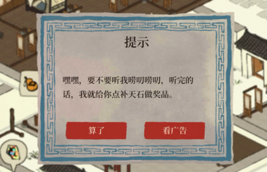 再比如,客栈门口的老乞丐也会来给你播片:只要你看广告,就给你补天石——到底他是乞丐还是我是乞丐??