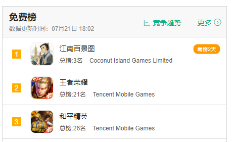 《江南百景图》具体有多火呢?在专业的数据统计网站上,江南百景图热度连续两天位居apple store第一,比农药和吃鸡这两个国民级游戏都高。