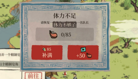 就拿出门探索来说,一次探索初始大概有300体力,然后砍一棵树就要花费30。偏偏探索任务又臭又长,需要的材料还是概率掉落,体力很快就没了。