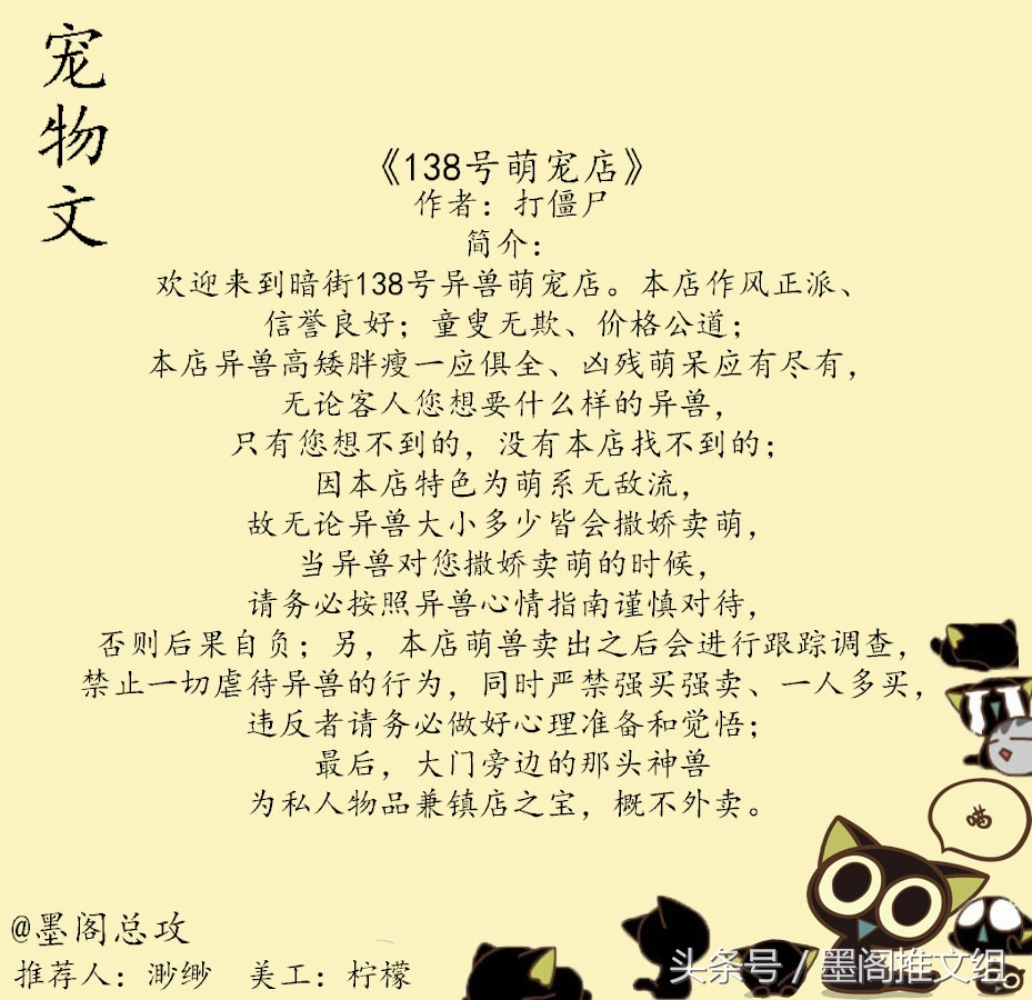 简介:欢迎来到暗街138号异兽萌宠店。本店作风正派、信誉良好;童叟无欺、价格公道;本店异兽高矮胖瘦一应俱全、凶残萌呆应有尽有,无论客人您想要什么样的异兽,只有您想不到的,没有本店找不到的;因本店特色为萌系无敌流,故无论异兽大小多少皆会撒娇卖萌,当异兽对您撒娇卖萌的时候,请务必按照异兽心情指南谨慎对待,否则后果自负;另,本店萌兽卖出之后会进行跟踪调查,禁止一切虐待异兽的行为,同时严禁强买强卖、一人多买,违反者请务必做好心理准备和觉悟;最后,大门旁边的那头神兽为私人物品兼镇店之宝,概不外卖。