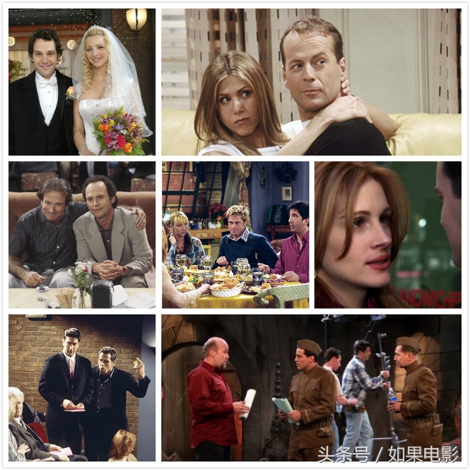 在《老友记》中,还有大牌明星客串,像布鲁斯·威利斯、布拉德·皮特、罗宾·威廉姆斯、丹尼斯·理查兹、查理·辛、乔治·克鲁尼、尚格云顿、加里·奥德曼、波姬小丝、茱莉亚·罗伯茨等等。值得说两句,在老友记中,你可以看到“蚁人”保罗·路德年轻的时候,以及钢铁侠的贴身保镖,乔恩·费儒瘦瘦的样子。
