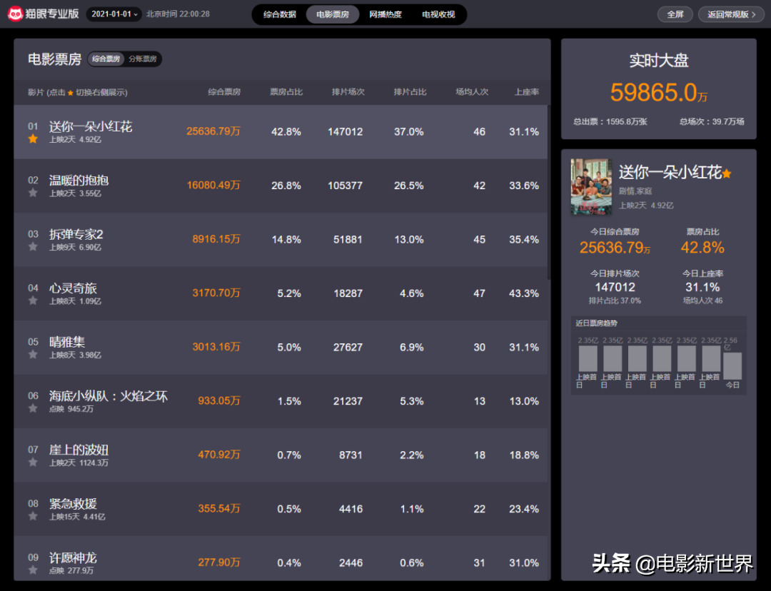 2021年元旦档期其实是从2020年的12月31日就开始了,因为这一天2020年的最后两部大片《送你一朵小红花》和《温暖的抱抱》首映了。