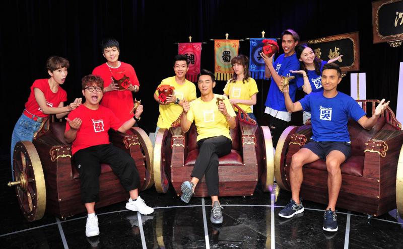 台视的《综艺3国智》,艺人嘉宾分成魏、吴、蜀三国,领队叫主公,其余三个队员分饰智将、武将、美人,各队比赛通过关卡,争取赢奖。