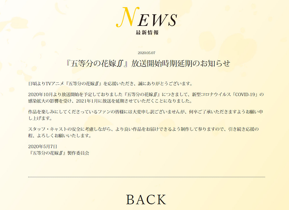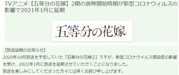 让人想要吐槽的是一般tv动画延期顶多也就延期一季,再不济就继续延期一季,没想到《五等分》第二季直接就将播放时间推迟到明年,这不是还有五个月吗。