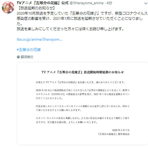 当然了,说到原因也无外乎是新冠病毒的疫情,日本那边还是比较严重的,大部分录音棚关闭、作画制作都是线上办公,原本应播出的时间档自然是没有办法遵循了,该延期的还是要延期。