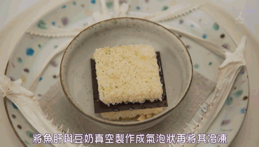 有将鱼肝与豆奶真空制作成气泡状再将其冷冻,蘸着干燥后的蓝莓果酱和云杉木油一起食用。