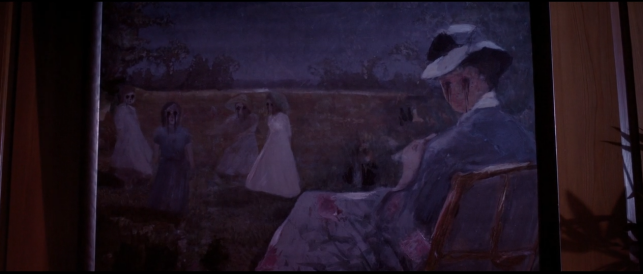 其实最有意思的部分是一直出现在影片当中的一幅画:没错就是壁炉上的,当在影片结尾成了这个样子,大家在观看影片时候可以经常见到这副画的特写,但是每次都会不一样。每一次的变化都对这对夫妇带来巨大的精神打击,导演的这种手法很有意思,用墙画的变化,对影片进行分割并且和其中一个情节相呼应,如下图: