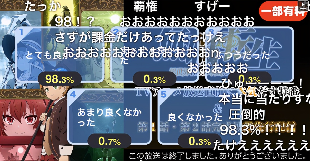 再者是日本那边,随着《无职转生》第一话部分内容的公开,n站上已经有不少粉丝给这部作品打分了,好评率高达98%,还看到有弹幕说是“霸权”的。如果不把《进击的巨人》算进去的话那确实是很有可能(毕竟12月放送的番,明年就不‘新’了),而把《巨人》算进来的话那还得看那时候的具体表现了。