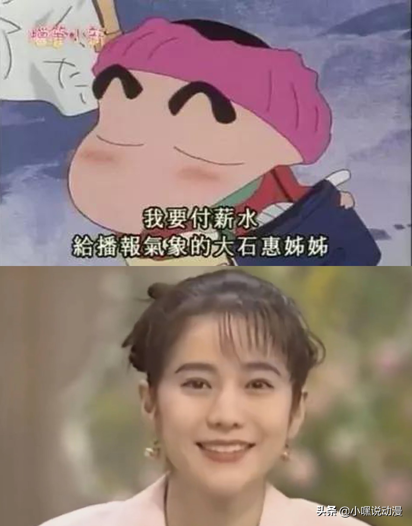 大石惠。小新的审美有多么毒辣,连气象播报员都被小新挖掘了出来。日本女歌手大石惠曾经在朝日电视台担气象播报员,由于颜值出众,所以大石惠很快就在日本大红大紫,而小新对于大石惠同样十分着迷。小新曾在动漫中表示如果有十万块钱,将会让大石惠到家里每天只播报气象给他一个人听,可见大石惠在当时有多么让粉丝疯狂。大石惠的颜值在那个年代简直可以用完美来形容。