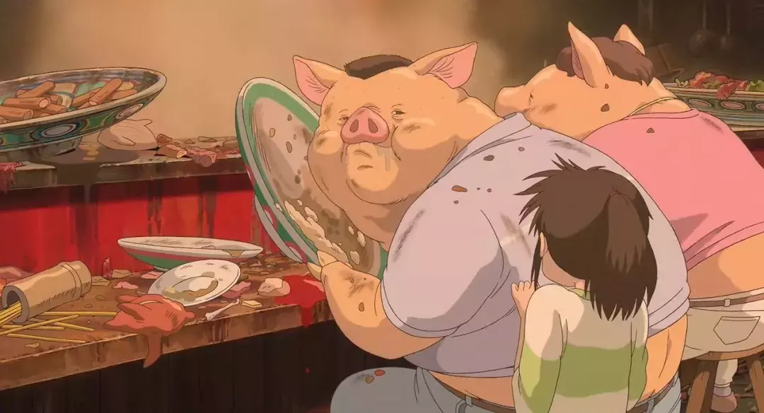 还有在电影的开头,千寻的爸爸妈妈坐在商铺里吃肉的那一段戏。