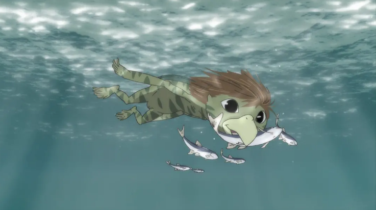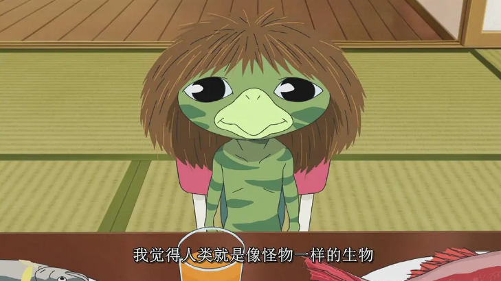 最终小咕见到了那个信件的主人,所谓的同类——基姆纳,是一只为了躲过人类装成人样的生物,虽说是河童的近亲,却早已褪去那绿色的皮衣,长出浓密的体毛。