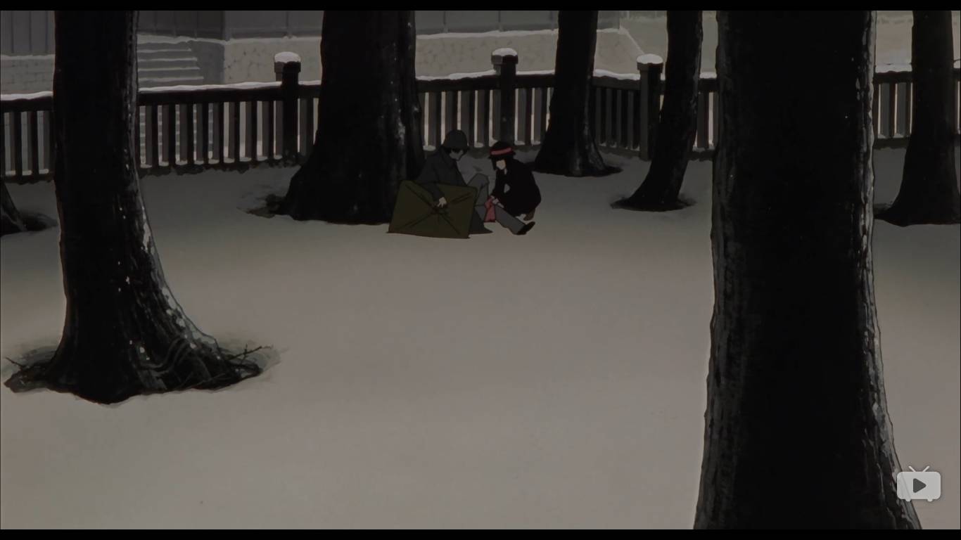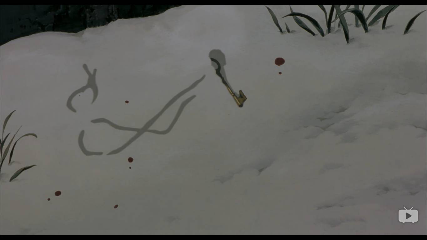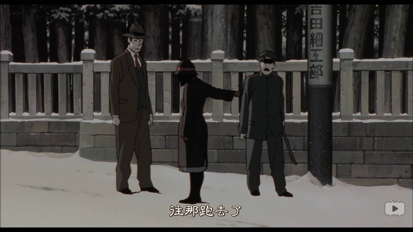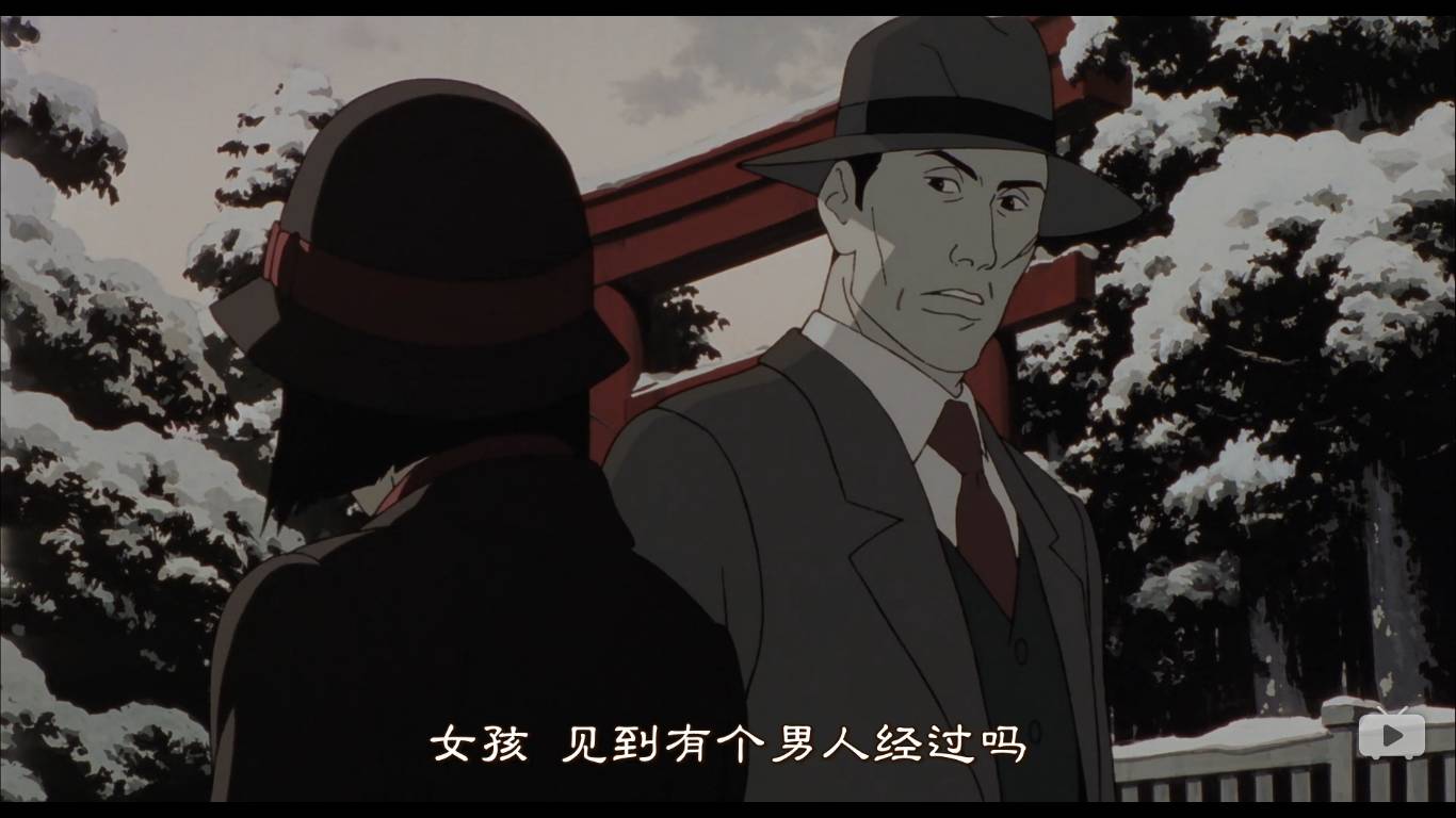 之后,有两个警察来追捕这个男人,问到千代子,千代子指了错误的方向,救了男人一命。这里有一个很滑稽的错误,既然天上下了雪,雪上有男人的血,为什么男人的脚印警察没有察觉呢,感觉今敏如此细心的一个人,犯下这个错误不可思议。