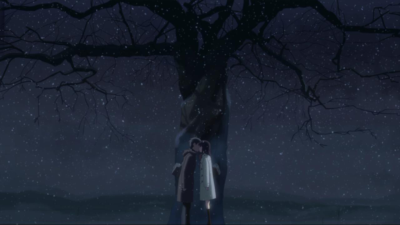 在缓缓飘落的雪花里,在干枯的樱花树下,两人献出了初吻,那个名为爱的东西在发芽。