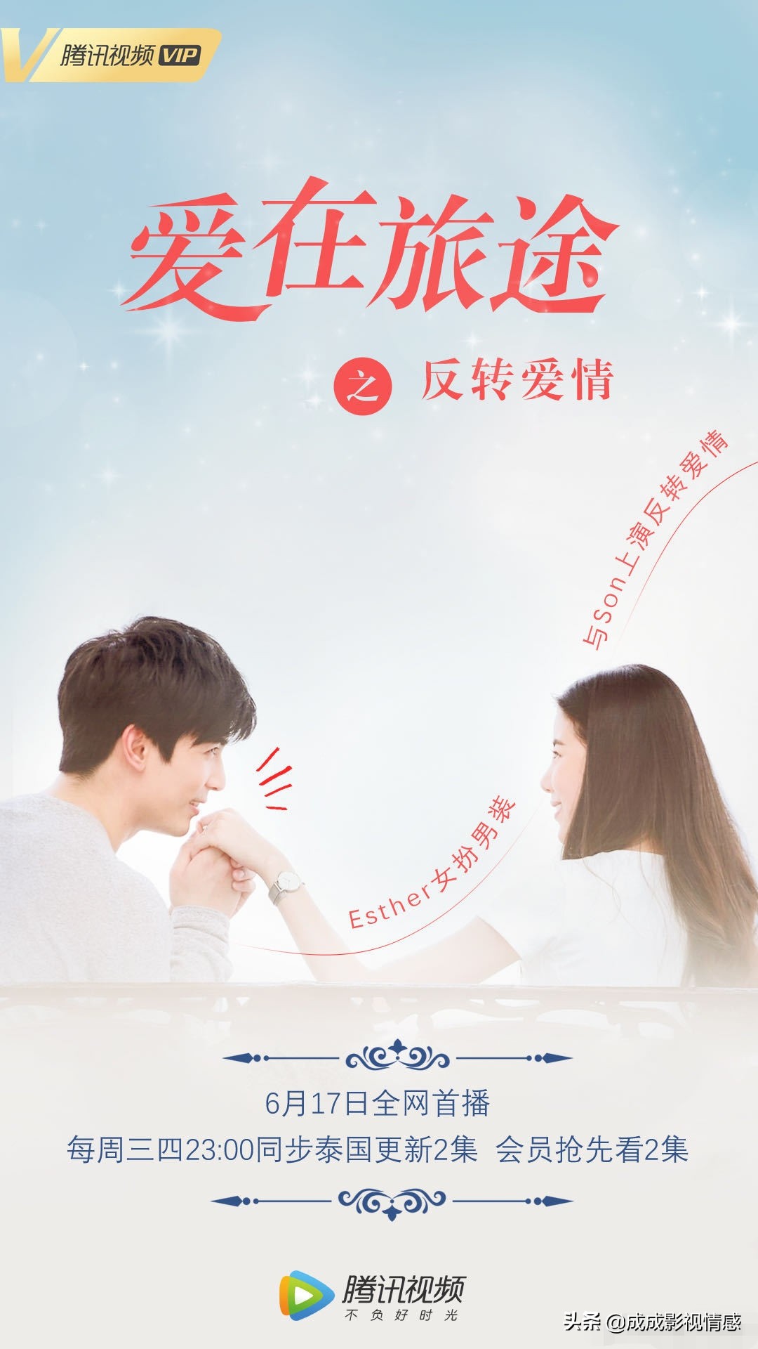 小尼姑esther和son首次搭档的新剧《爱在旅途之反转爱情》定档6月17日起腾讯视频、爱奇艺、优酷同步泰国播出。