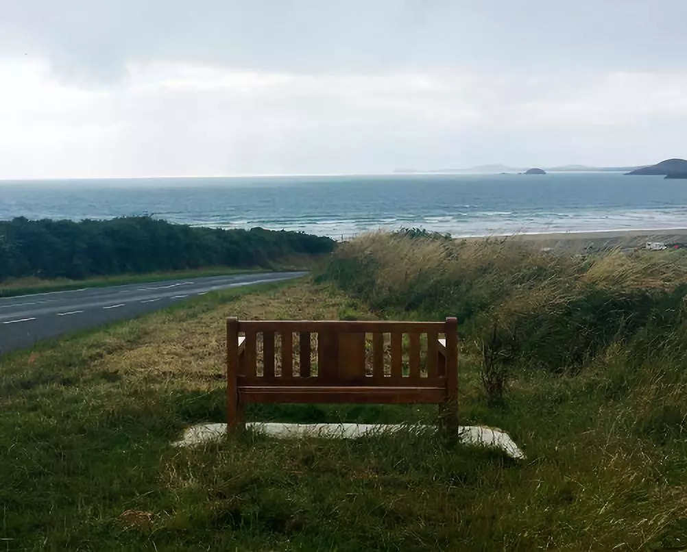 威尔士西南端,繁忙的海滨公路旁的一张长木椅。
