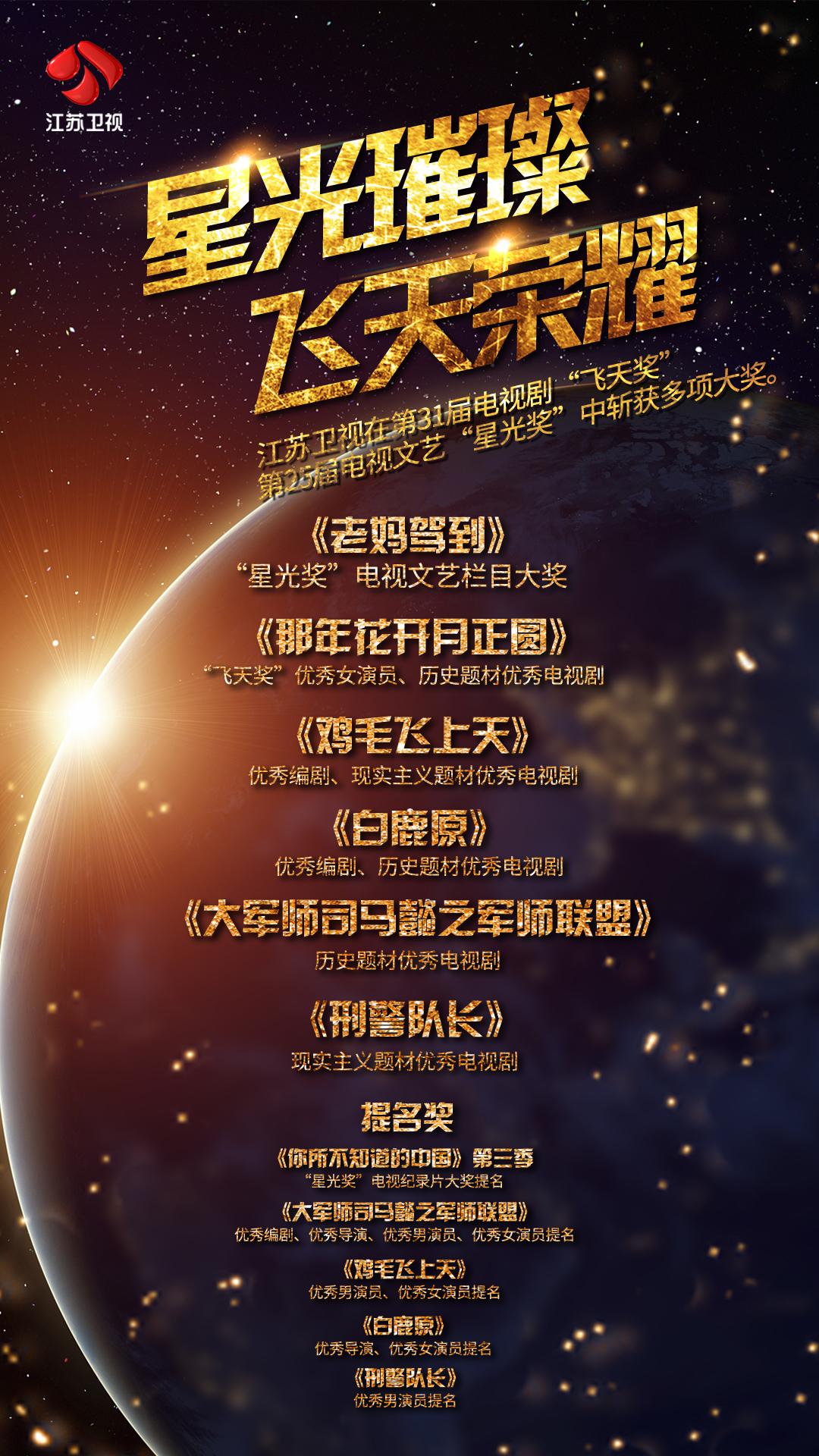 昨晚,第31届电视剧“飞天奖”、第25届电视文艺“星光奖”颁奖典礼圆满召开。本次评选中,江苏卫视播出的电视栏目以及电视剧均有所斩获。代际沟通亲情观察类节目《老妈驾到》获得“星光奖”电视文艺栏目大奖。在电视剧方面,江苏卫视共有5部热播剧登上领奖台:电视剧《那年花开月正圆》女主角孙俪获得“飞天奖”优秀女演员,电视剧《鸡毛飞上天》《白鹿原》编剧申捷获得“飞天奖”优秀编剧奖。《鸡毛飞上天》《刑警队长》被评为现实主义题材优秀电视剧。《白鹿原》《大军师司马懿之军师联盟》《那年花开月正圆》被评为历史题材优秀电视剧。