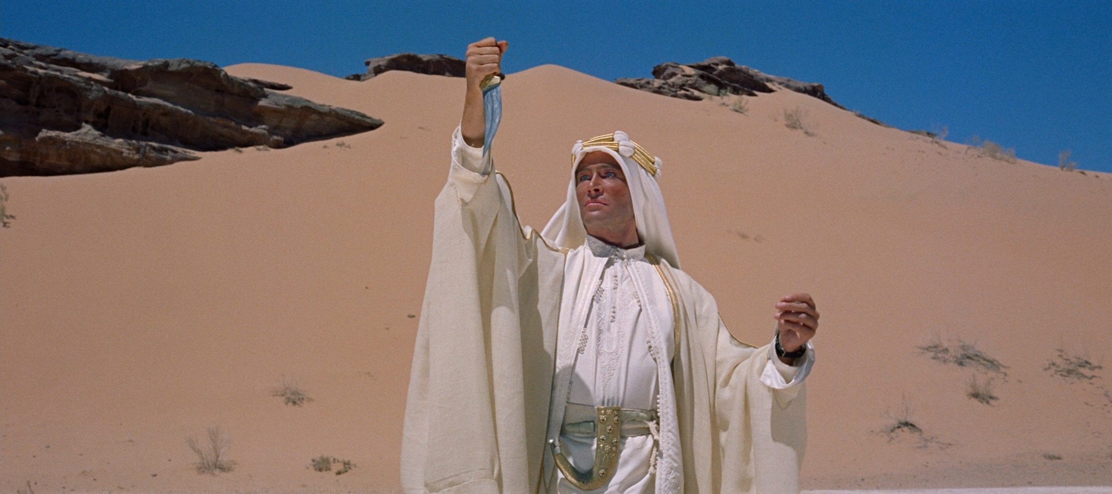 影片在这样的主线中,随着银幕上一帧帧沙漠美景的流过,将观众深深的吸引到了那个神秘的,深藏在沙漠中的阿拉伯世界。如果去掉影片中的战斗场面和故事情节,单独的将沙漠的镜头剪辑重排的话,这些美景也足以吸引银幕前的观众观看几个小时。