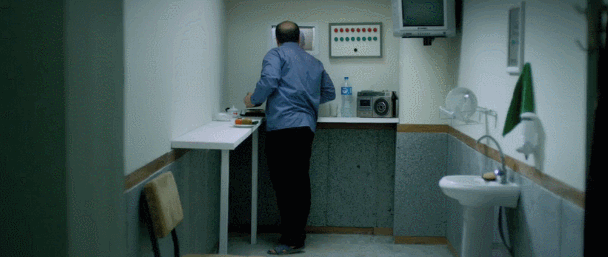 只见他来到狭小房间,洗手、喝水、吃东西。