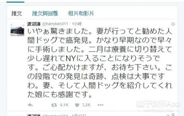 在推特上,渡边谦还告诫大家“健康检查真的很重要,我要谢谢老婆,还有谢谢女儿催我去做检查。”