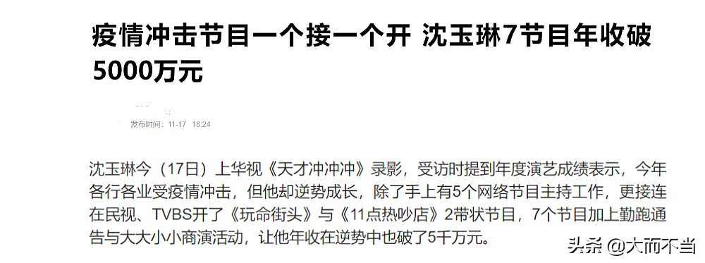 光这7个节目沈玉琳就年入超5000万(台币),加上每年至少20场尾牙,收入破6000万绰绰有余。