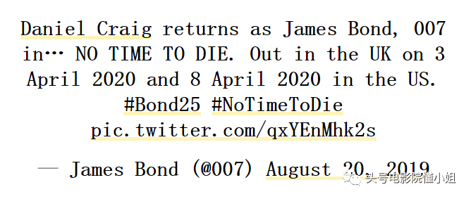 这个经典间谍系列片的第25部,将以《no time to die》命名!(粗暴的直译:没时间去死)。