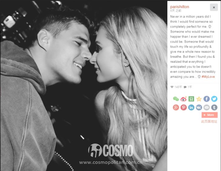 而在订婚之前,希尔顿的桃心泡泡就已经满屏跑了。讲真,paris hilton的恋爱状态真的像个小女孩儿,她会在ins上直呼chris zylka为“my love”,爱得很炙热,就像是十几岁的初恋少女般。