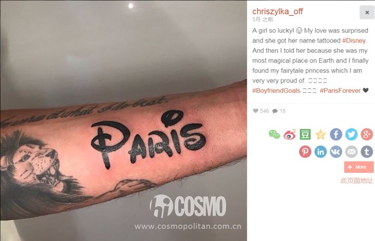 chris zylka同样如此,还直接把paris的名字纹在了身上。