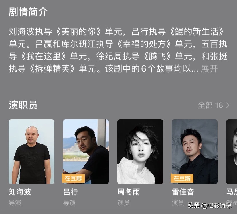 这部多单元组成的电视剧一共有6个小故事,7个导演执导故事内容分别都是以真人或真实事件为素材进行改编。
