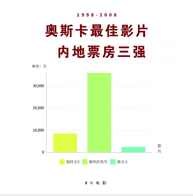 总结1998年至2008年,奥斯卡最佳影片能在内地有票房的,全都是商业大制作。确实,在那个时期,猫眼豆瓣没有兴起,也没有优秀的自媒体引导,观众对电影的选择几乎只注重娱乐性。所以结果就是,奥斯卡选择几部商业片,就有几部最佳影片在中国有票房成绩。