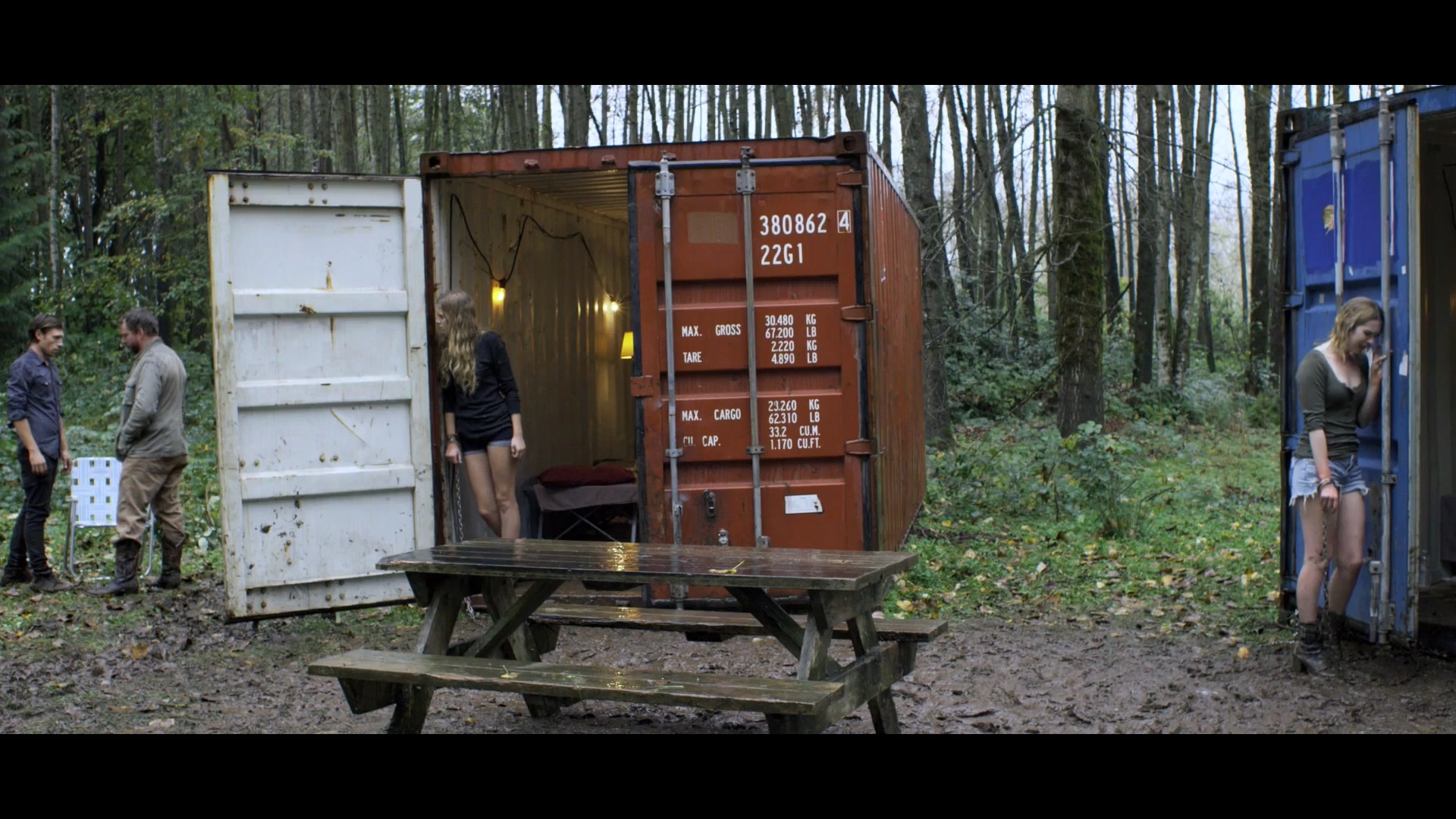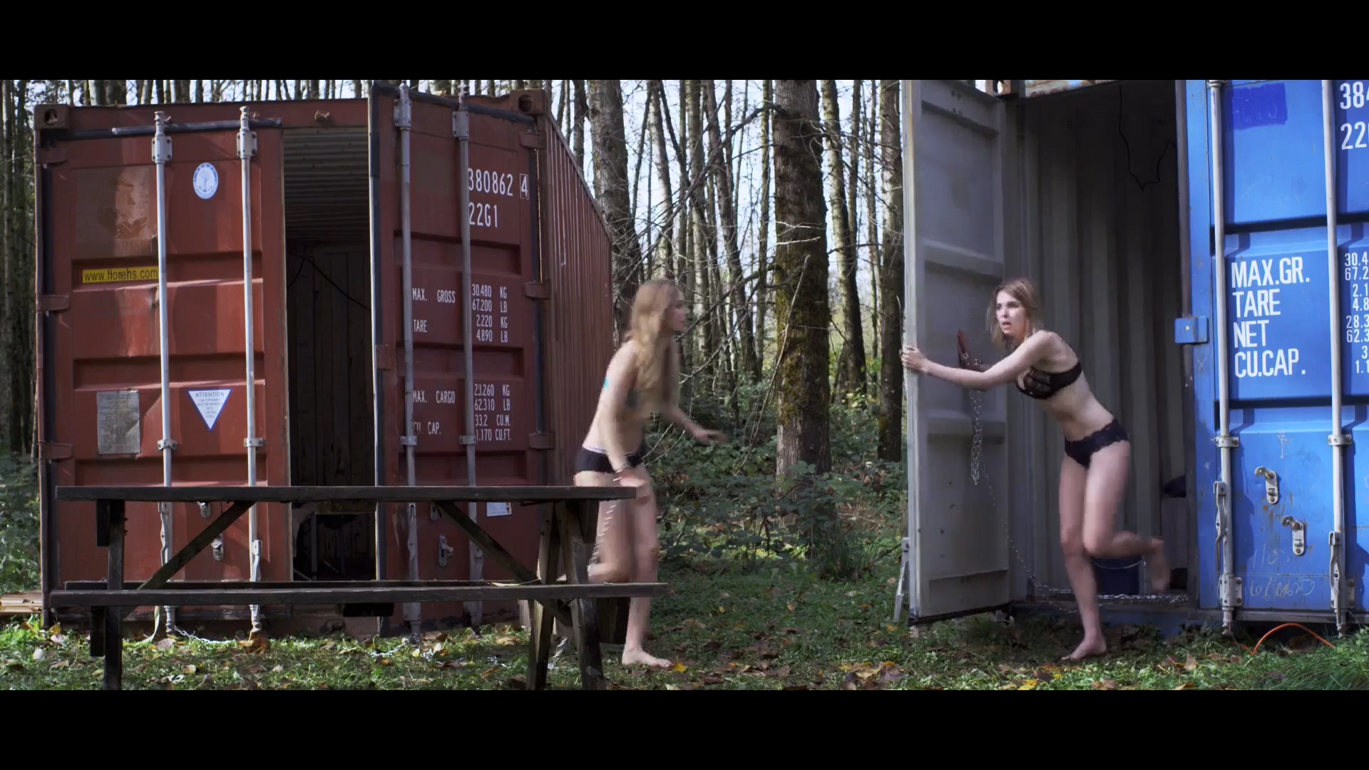 当她们再次醒来,已经身处森林深处,两人脱的仅剩内衣,锁着大铁链,分别拷在集装箱上。她们害怕极了大声呼救。这时大帅拿着枪走来。露出了真实嘴脸,他告诉两人方圆十公里连个鸟都没有,你们叫吧,叫破喉咙都没人听见。还让她们既来之则安之。说着拿出一些生活用品和衣服给她们。原来大帅他们干的是逼良为娼的勾当。专挑年轻漂亮的女性绑架,让她们沦为赚钱的工具。