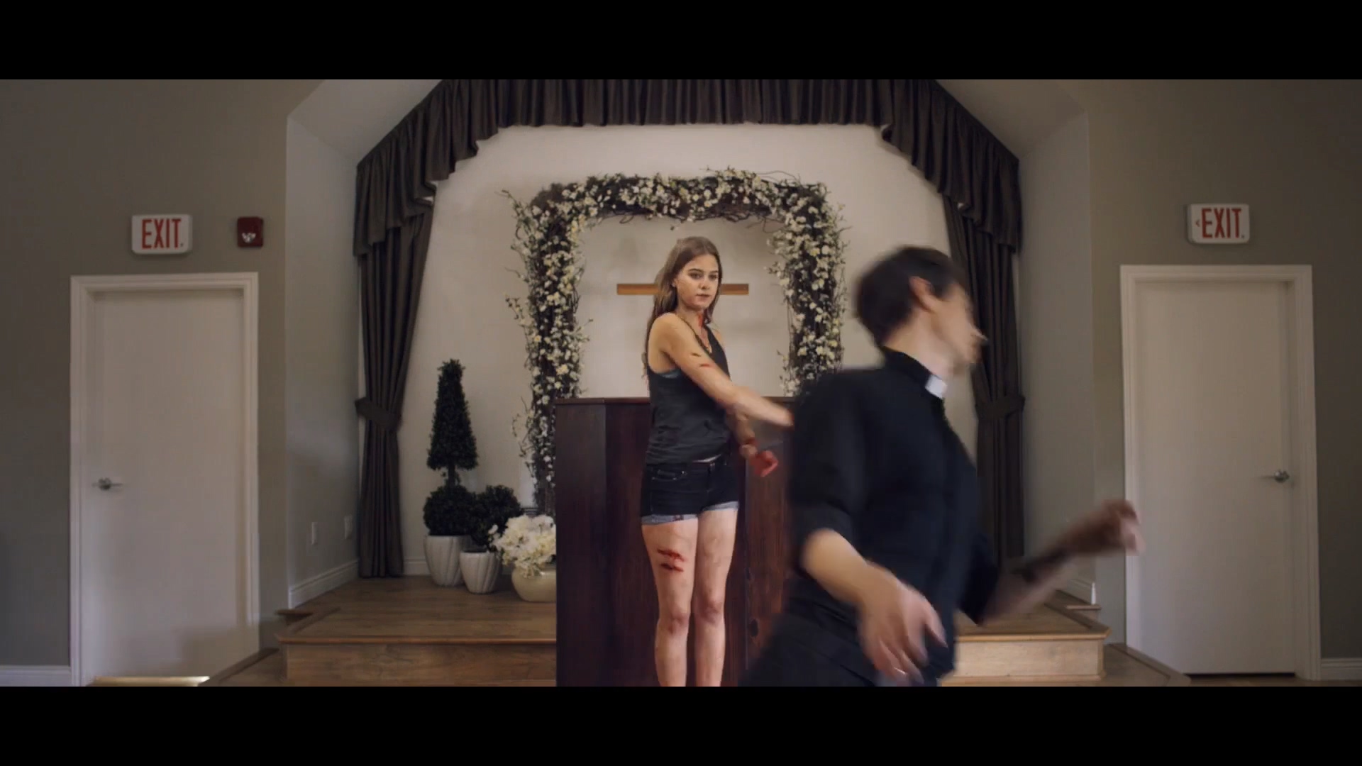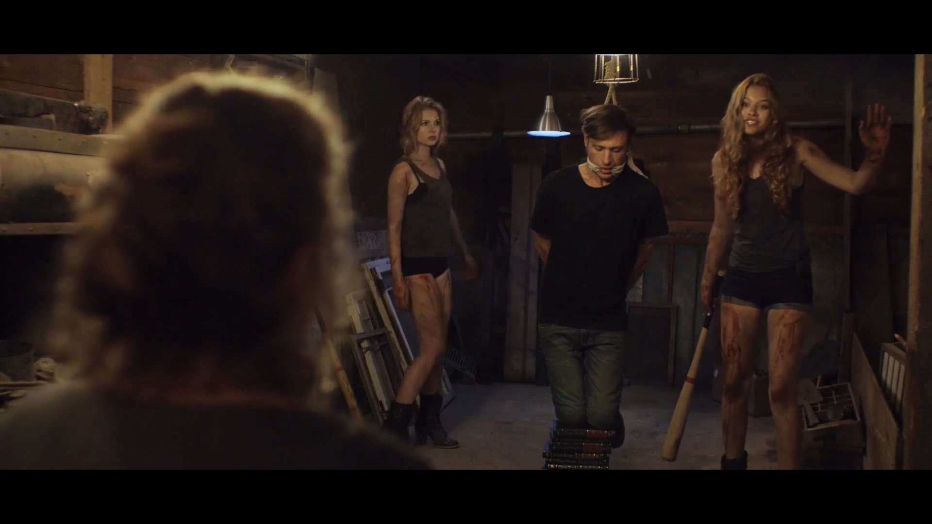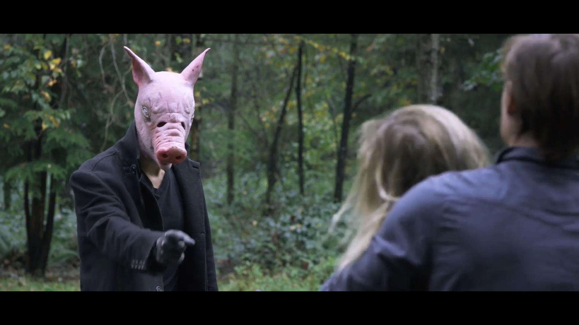 两个年轻的女孩就这样被折磨的死去活来,然而这非人的折磨才刚刚开始,一名带着猪头面具的变态男出现,小美和小亮吓的尖叫连连,虽然看不见他的脸,但猪头男小臂上的十字架纹身清晰可见。猪头男选择了小亮,又是一阵生不如死,当小美打开门时,小亮头顶猪头面具泣不成声。