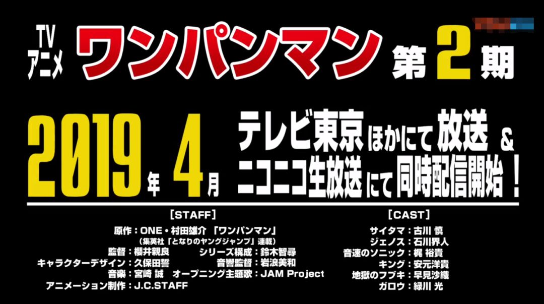 不过,就在这之后(大概就是今年的9月份吧),《一拳超人》制作组也对外发布了一辑预告片。虽然剧情的画面通通是第一季动画的剪辑,但在后面的文字解读里,却赫然标记了准确的时间:2019.4.