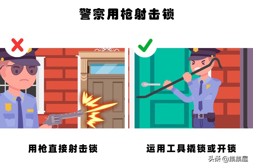 在一些犯罪题材的电影里,当警察需要拯救他人或追逐罪犯的时候,为了能够闯入大门,可能会用枪来射击锁。但在现实中,警察通常不会这么做,因为这么做很危险,子弹可能会反弹并伤人。他们更有可能做得是撬锁或用工具开锁。
