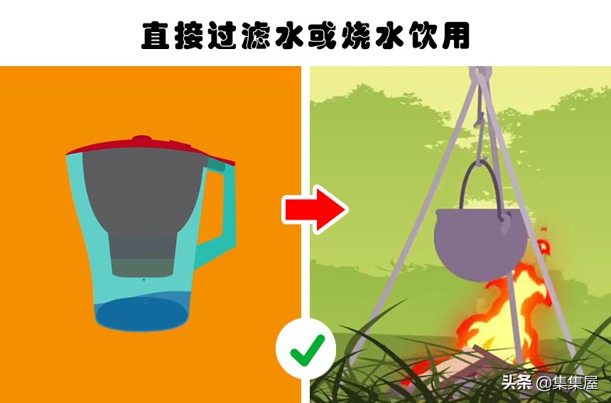 电影里可能会出现主角使用自制过滤器的方式来过滤野外找到的水,然后再饮用;又或者是直接将找到的水煮沸以后饮用。但这种方式都并不完全正确,除非能够将这两点合并在一起。即先过滤水源,然后再将过滤好的水煮沸。原因很简单,仅仅是简单的将野外找到的水煮沸,并不能够清除水中的有害元素,而单纯的过滤而不煮沸,则去除不了里边的细菌。