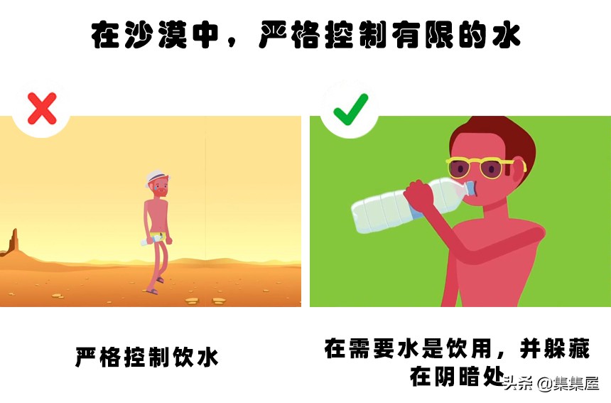 在电影中,如果主角被困沙漠当中,而身上携带的水源有限,那么他们很可能会严格的控制或分配水源。甚至在已经身体感到极为难受的时候也控制自己不喝水,因为水被规定必须在某个时间里才能用。乍看之下,这似乎是非常合理的一种技巧和方式。但在现实生活中,如果你这么做,那将是非常危险的。原因在于,沙漠的恶劣环境会让你快速的流失过多的液体,如果你一直抑制自己不喝水,那可能会你的身体快速的脱水,从而晕倒过去。这是非常危险的。正如我们在上面所说的,你应当躲藏在阴暗处,这样可以减少身体液体的减少,等温度下来了你再行走也不迟。