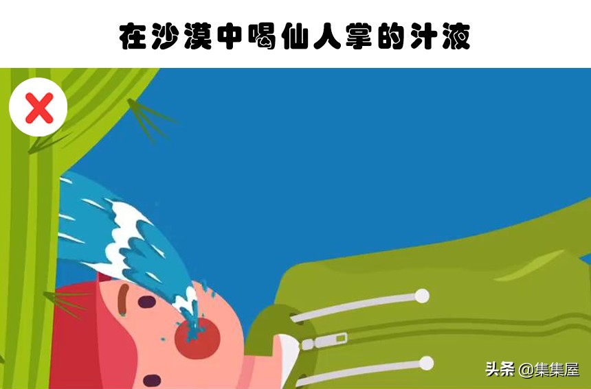 同样是在沙漠中,当失去了水源了以后,电影里的主角可能会在看到仙人掌了以后,直接割开仙人掌并进食里面的液体。但这同样是不现实的一种状况,因为大多数的仙人掌都是有毒的,普通人根本无法分出仙人掌的种类,更别说是否知道它有没有毒。如果随意吃它们,很可能导致食物中毒,让自己因为拉肚子而失去更多的水分,从而出现脱水。