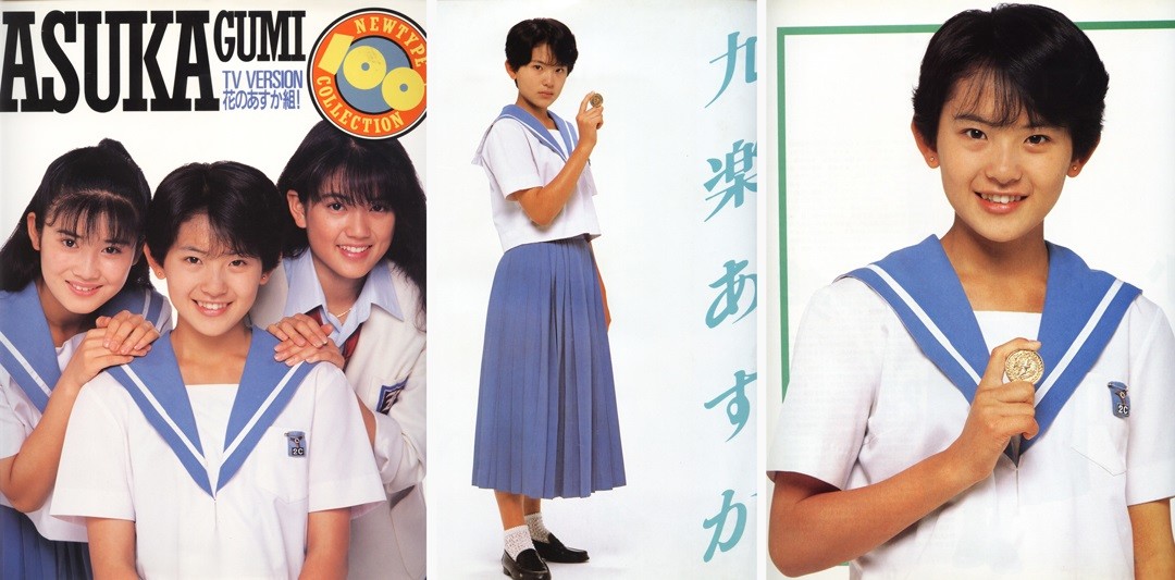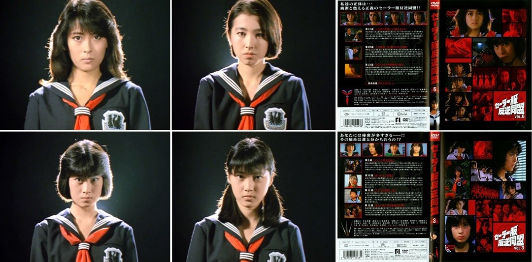 到了终盘阶段飞鸟组也玩起了风间三姐妹的合唱模式,三位主演以“あすか組”的名义推出了单曲《悲しげだね》,只是没有她们的前辈那么火。1986年播出的《水手服反逆同盟》由中山美穂和仙道敦子主演,这也是中山美穂早期的日剧作品,演技也相当生硬,这样来看88年偶像四天王中除了木村嫂其他三位都是飞女出身。这是一部当时富士电视台为了与飞女刑事对抗而推出的作品,讲述了黑鸟学园一批有着黑暗过去的少女结成了名为水手服反逆同盟的组织,特征是白色的水手服和夸张的浓妆,由山县、高坂、弓削、涉川组成。中山美穂饰演的山县美穗为黑鸟学园理事长的女儿,本应是大小姐的她却厌恶现有学园体制,她的绝招居然是扔蔷薇,在她手里冷不丁射出来的花朵可以变得像利箭一般可以伤人,在剧情前期由于档期的关系作为主角之一的她较少登场,而主要由仙道敦子饰演的高坂由美撑场。高坂由美是作为领导了反逆联盟的全能优等生,童年时受到过母亲虐待并在其叔父门下练习过空手道,其武器为叔父赠予的带有锁扣的皮质拳套。另外两位成员弓削琉璃的武器为雕刻刀,涉川惠的武器为树脂制成的锁链。