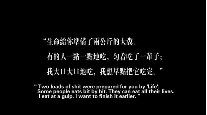 “人生是两公斤大粪,早吃晚吃都是吃,有人选择一点一点匀着吃,而我选择大口大口吃。”