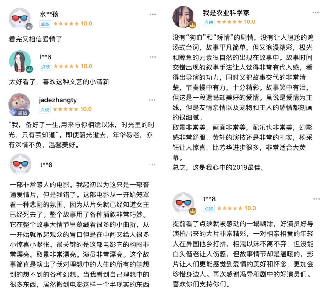 随着点映场次更大规模的开放,观众口碑也被彻底引爆,豆瓣、淘票票等平台上评分也随之节节攀升,网络媒体上越来越多的观众也表达了自己对这部影片的喜爱:本年度最动人爱情片;看完又相信爱情了;很唯美很暖,后劲很足;上映后值得带父母二刷三刷。